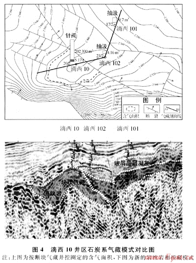 2) 滴西10井區(qū)。滴西10井鉆于2003年,石炭系巖性為流紋巖,2004年在石炭系試氣2層均獲得高產(chǎn)工業(yè)氣流。按照頂面構(gòu)造控藏模式,2004、2005年分別鉆探滴101井和滴102井2口評價井,石炭系巖性均為凝灰?guī)r,無油氣顯示。2005年底,按斷鼻構(gòu)造氣藏圈定滴西10井井控面積4.74km2(圖4中的上圖),探明天然氣地質(zhì)儲量20.20×108m3。2006年,對滴西10井區(qū)按巖性圈閉模式進行了重新解釋,提出了新的氣藏模式(圖4中的下圖),并對滴102井進行了加深鉆探以驗證新模式。滴102井于3310m開始加深,3460m完鉆,至3340~3370m井段鉆遇流紋巖與滴西10井出氣段巖性一致。鉆探結(jié)果證實了新模式的正確性,指導了后續(xù)探井的部署。2008年,按照巖性巖相控藏模式,鉆探了滴103井和滴104井,均獲得成功,新增含氣面積13.57km2,新增探明天然氣地質(zhì)儲量83.07×108m3。