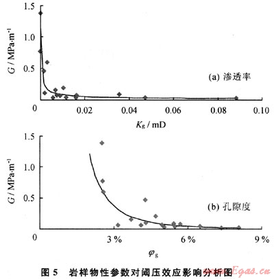 滲流機(jī)理實(shí)驗(yàn)研究表明:低滲透儲(chǔ)層的孔隙度、滲透率及含水飽和度達(dá)到一定程度時(shí),普遍存在著閾壓效應(yīng)。閾壓效應(yīng)的典型特征是當(dāng)壓力梯度達(dá)到一定程度時(shí),氣相才能保持連續(xù)流動(dòng)狀態(tài),該壓力梯度稱(chēng)為臨界壓力梯度。臨界壓力梯度值越大,閩壓效應(yīng)越明顯,反之越小。不同巖樣物性參數(shù)條件下,臨界壓力梯度值不同。圖5為閾壓效應(yīng)、臨界壓力梯度(G)與物性參數(shù)的關(guān)系曲線(xiàn)??梢钥闯觯弘S著氣相有效孔隙度、有效滲透率增加,對(duì)應(yīng)的臨界壓力梯度逐漸降低;臨界壓力梯度與物性參數(shù)存在較好冪函數(shù)關(guān)系。