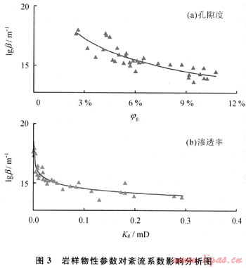 高速非達(dá)西滲流特征是多孔介質(zhì)中氣體滲流普遍存在的特殊滲流現(xiàn)象。不同的物性參數(shù)條件下高速非達(dá)西滲流效應(yīng)對(duì)氣體滲流的影響程度不同,紊流系數(shù)(β)的大小直觀(guān)反映了高速非達(dá)西對(duì)氣體滲流的影響程度。物性參數(shù)與紊流系數(shù)關(guān)系實(shí)驗(yàn)結(jié)果見(jiàn)圖3???/span>體而言,隨著氣相有效孔隙度及氣相有效滲透率增加,紊流系數(shù)逐漸減小,表明儲(chǔ)層物性越差高速非達(dá)西滲流效應(yīng)越明顯。