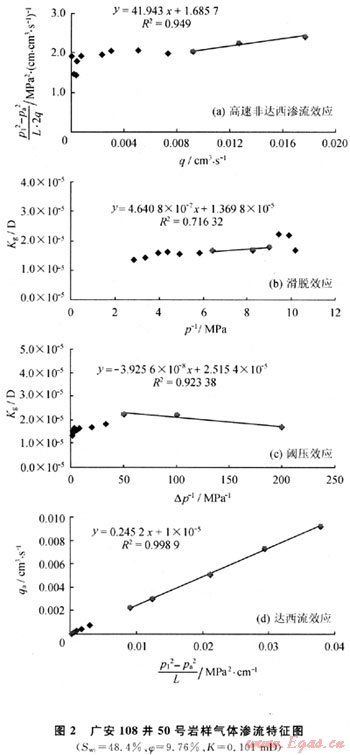 含水巖樣由于孔隙度、滲透率以及束縛水飽和度差異,氣體滲流表現(xiàn)為不同的滲流效應(yīng)。兩者差異主要表現(xiàn)在低速段:對(duì)于如圖2所示巖樣,氣體首先必須克服由于水相在孔隙喉道處堵塞引起的附加壓力才能流動(dòng),即存在明顯閾壓效應(yīng);隨著實(shí)驗(yàn)壓差增大,表現(xiàn)為滑脫效應(yīng)占主導(dǎo)地位的滲流段;其后依次逐漸過(guò)渡為達(dá)西滲流、高速非達(dá)西滲流效應(yīng)占主導(dǎo)地位的階段。結(jié)合前人研究成果,判斷氣體滲流形式與巖樣儲(chǔ)層物性、孔喉大小、含水飽和度以及水膜厚度大小有關(guān)。