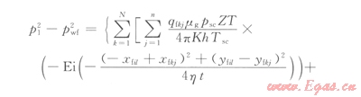 pi為地層原始?jí)毫Γ?span lang="EN-US">Pa;pwf為井底流壓,Pa;N為裂縫條數(shù),條;n為裂縫等分?jǐn)?shù),個(gè);qfkj為第k條裂縫第j個(gè)點(diǎn)匯的產(chǎn)量,m3/s;μg為黏度,Pa·s;psc為臨界壓力,Pa;Z為氣體偏差因子,無(wú)因次;T為氣層溫度,℃;K為地層滲透率,mD;h為儲(chǔ)集層厚度,m;t為生產(chǎn)時(shí)間,s;Tsc為氣體臨界溫度,℃;xfil為第i條裂縫第l個(gè)點(diǎn)匯的橫坐標(biāo),m;xfkj為第k條裂縫第j個(gè)點(diǎn)匯的橫坐標(biāo),m;yfil為第i條裂縫第l個(gè)點(diǎn)匯的縱坐標(biāo),m;yfkj為第k條裂縫第j個(gè)點(diǎn)匯的縱坐標(biāo),m;η為導(dǎo)壓系數(shù),0.