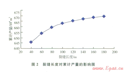 圖2是不同裂縫半長(zhǎng)生產(chǎn)1年的累計(jì)產(chǎn)量結(jié)果。可以看出,隨著裂縫長(zhǎng)度增加,累計(jì)產(chǎn)量逐漸增大,隨著裂縫長(zhǎng)度進(jìn)一步增加,增幅變小。這是因?yàn)榱芽p長(zhǎng)短反映了儲(chǔ)層的供氣面積大小。當(dāng)裂縫長(zhǎng)度增加到一定程度后,縫長(zhǎng)越大,氣體在裂縫中流動(dòng)時(shí)的摩阻越高,反而會(huì)影響產(chǎn)量。在本算例中,最佳裂縫半長(zhǎng)為60~80 m。