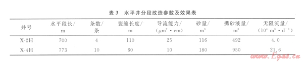 依據(jù)上述研究論證結(jié)果,確定了合理的壓裂水平井參數(shù),以保證投資最少、開發(fā)效果最優(yōu)為目的。使用優(yōu)化的壓裂水平井裂縫參數(shù)在該區(qū)塊應(yīng)用了8口井,單井無(wú)阻流量7.2×104~27.6×104 m3/d.平均無(wú)阻流量為16.3×104 m3/d,與參數(shù)優(yōu)化前的無(wú)阻流量9.8×104 m3/d相比,增產(chǎn)效果顯著。