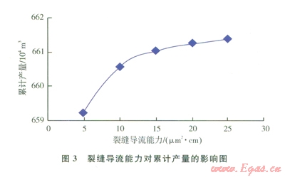 圖3是累計(jì)產(chǎn)量與裂縫導(dǎo)流能力的關(guān)系曲線。可以看出,存在累計(jì)產(chǎn)量與裂縫長(zhǎng)度相似的變化規(guī)律。隨著導(dǎo)流能力增加,累計(jì)產(chǎn)量先逐漸增大后趨于平穩(wěn)。要充分發(fā)揮致密氣藏壓裂水平井的潛能,就要使裂縫導(dǎo)流能力與地層滲透率相匹配。本算例中,推薦最佳裂縫導(dǎo)流能力為10~15μm2·cm。