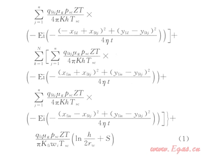 將裂縫單翼均等分成竹份,每等份可以看成是一個(gè)點(diǎn)匯。利用無(wú)限大均勻地層點(diǎn)匯定流量的壓降公式,可以求出該點(diǎn)匯對(duì)地層中任意一點(diǎn)產(chǎn)生的壓降[8-10];將地層任意一點(diǎn)替換為裂縫尖端,就可以得到所有點(diǎn)匯同時(shí)生產(chǎn)時(shí)對(duì)裂縫尖端產(chǎn)生的壓降;考慮到裂縫半長(zhǎng)遠(yuǎn)大于水平井筒半徑,裂縫內(nèi)流體從裂縫邊緣向井筒周圍聚集,第i條裂縫可以看成是流動(dòng)直徑為裂縫長(zhǎng)度、地層厚度為裂縫寬度、邊界壓力為裂縫尖端壓力、井底流壓為水平井井筒內(nèi)壓力的微型平面徑向流油藏;根據(jù)壓力連續(xù)和流量守恒方程,就能得到考慮裂縫干擾的壓裂水平井油井產(chǎn)量預(yù)測(cè)模型[2,5];進(jìn)一步根據(jù)壓力函數(shù)的定義和真實(shí)氣體狀態(tài)方程,并將地層條件下的產(chǎn)量換算為地面標(biāo)準(zhǔn)情況下氣體產(chǎn)量,就可以得到氣藏壓裂水平井產(chǎn)量預(yù)測(cè)模型: