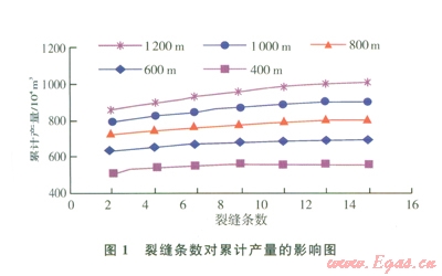圖1是不同水平段長(zhǎng)度、不同裂縫條數(shù)下生產(chǎn)l年的累計(jì)產(chǎn)量??梢钥闯?,隨著裂縫條數(shù)增加,累計(jì)產(chǎn)量先增加最后趨于平穩(wěn)。因?yàn)殡S著裂縫條數(shù)增加,裂縫間距變小,相互間干擾加重,導(dǎo)致每條裂縫產(chǎn)量減小造成的。考慮到裂縫條數(shù)增加,作業(yè)成本增大,因此存在一個(gè)最佳裂縫條數(shù)。當(dāng)水平段長(zhǎng)度為