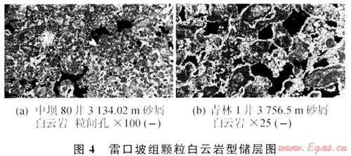 從LG地區(qū)及川中地區(qū)鉆探情況看,構(gòu)成該類儲(chǔ)層的巖性主要是顆粒白云巖、細(xì)粉晶白云巖和含膏??啄嗑О自茙r,其中以顆粒白云巖最好。儲(chǔ)集空間有粒內(nèi)和粒間溶孔、晶間溶孔和膏??准拔⒘芽p,如圖3所示。