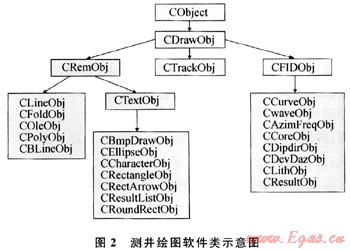 要解決這些問題,采用面向?qū)ο蟪绦蛟O(shè)計(jì)理念是最佳的選擇[3]。在圖2軟件主要類的劃分及繼承關(guān)系圖中,CDrawObj類是直接從CObject繼承而來的所有測井圖形類的基類,主要保存著圖形對象的繪圖區(qū)域(m_Rect)和當(dāng)前繪圖文檔的指針(*pDoc),完成光標(biāo)在屏幕上的滾動DoScroll(CScrollView*pView),保存、顯示當(dāng)前光標(biāo)所在位置等功能,它是測井繪圖軟件所有對象動態(tài)識別的入口。