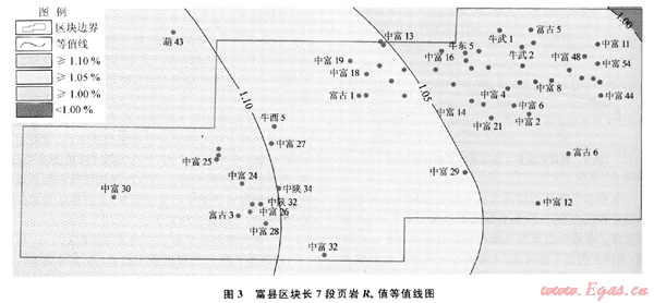 根據(jù)美國和加拿大的勘探開發(fā)結(jié)果,形成頁巖氣的頁巖有機(jī)質(zhì)成熟度(Ro)值為0.4%~3.0%。如Barnett頁巖的成熟度就屬于中等-較高范圍,Ro為1.0%~2.1%[9]。區(qū)域上對延長組有機(jī)質(zhì)熱演化的研究表明,早白堊世中期進(jìn)入成熟門限,早白堊世末期進(jìn)入大量生烴門限,古近紀(jì)進(jìn)入高成熟期。富縣地區(qū)曾經(jīng)是埋深最大的生油中心,Ro值大于1%,有機(jī)質(zhì)成熟度較高。該區(qū)中富2、中富30、葫43井主要生油巖長7段鏡質(zhì)體反射率分別為1.13%、1.06%、1.10%;總體上西部頁巖有機(jī)質(zhì)演化程度高于東部(圖3)。