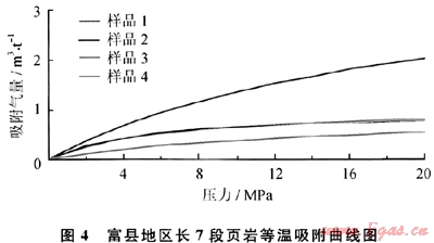 為了解該區(qū)頁巖的吸附能力,在鉆井巖心中采集4個樣品進(jìn)行等溫吸附試驗,試驗條件為:試驗溫度為35℃(大約相當(dāng)于1000m埋深的地溫),采用純甲烷在平衡濕度條件進(jìn)行,試驗結(jié)果為:蘭氏體積為0.98~3.96cm3/g,平均為1.75cm3/g;蘭氏壓力為5.19~19.23MPa,平均為11.89MPa(圖4)。