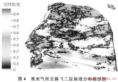 裂縫指數(shù)模型是通過裂縫研究成果(單井裂縫指數(shù))這一指標,利用序貫指數(shù)計算方法建立的裂縫分布模型(圖4)。