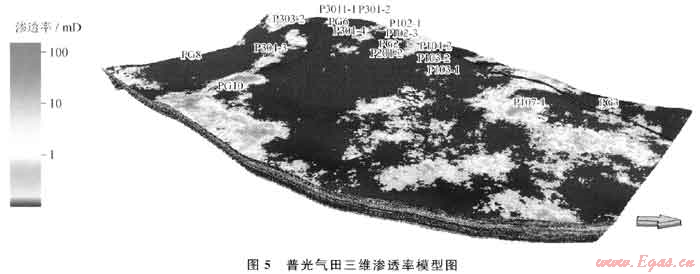 普光氣田儲集空間類型多樣,以孔隙為主,局部發(fā)育裂縫??紫抖群蜐B透率的關系受多種因素的控制,相關性不好。為此,在建立滲透率模型時分兩步進行:①由于儲層孔隙類型不同導致孔隙度與滲透率關系多樣化,在計算滲透率模型時,首先通過單井測井曲線聲波與密度的相對幅度差判斷孔隙結(jié)構(gòu)類型,按照不同孔隙結(jié)構(gòu)類型的孔滲關系式,由各井測井孔隙度計算出單井各層面不同孔隙類型的滲透率;②由于裂縫的存在,孔隙度變化不大,而滲透率卻成倍增大,因而在對滲透率模型計算時引入裂縫指數(shù)數(shù)據(jù)體對滲透率進行裂縫校正。