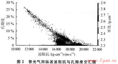 地震資料的優(yōu)勢在于能夠提供遠離井點的儲集層信息.但該數(shù)據(jù)體是否能用于約束儲集層參數(shù)建模,還需要進一步分析其與儲集層物性參數(shù)的相關性,只有兩者相關性好,方可用地震資料反演約束建模。選擇何種地震屬性作為約束條件,以及利用地震數(shù)據(jù)體對何種儲層參數(shù)做約束是這種建模方法中很重要的一個環(huán)節(jié)。通過分析認為,孔隙度曲線與地震反演波阻抗之間存在良好的負相關(圖2),即高孔隙度層段通常都對應于低波阻抗反射波,而低孔隙度層對應于高波阻抗。