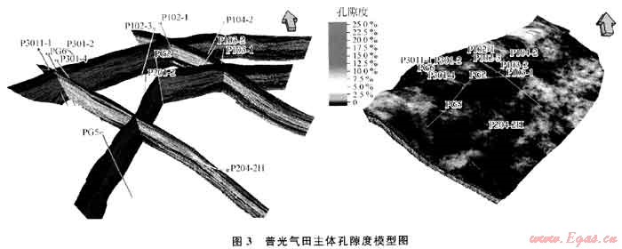 普光地區(qū)儲層屬于碳酸鹽巖礁灘相沉積,針對儲層儲集空間的類型多樣,儲層厚度大、非均質(zhì)性較強,存在多套氣水關系等地質(zhì)特點,綜合利用地震、測井及地質(zhì)等資料,在對儲層主控因素分析的基礎上,根據(jù)確定性建模與隨機建模相結(jié)合的原則、等時建模原則、地震數(shù)據(jù)約束建模原則,利用序貫高斯模擬法、克里金模擬法,對儲層物性空間分布的非均質(zhì)性進行了細致的描述,建立普光氣田主體構(gòu)造儲層模型。