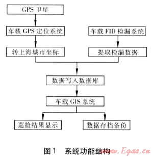 利用公司現(xiàn)有的數(shù)據(jù)和軟件平臺(tái),將車載FID、車載GPS、GIS信息系統(tǒng)三者相結(jié)合,構(gòu)建起市北公司燃?xì)夤芫W(wǎng)泄漏的早期預(yù)警系統(tǒng)。其工作原理為FID檢漏儀檢測(cè)到管網(wǎng)泄漏點(diǎn)后,系統(tǒng)將完成兩項(xiàng)任務(wù),一方面自動(dòng)讀取車載檢漏儀所采集到的數(shù)據(jù),將其寫(xiě)入數(shù)據(jù)庫(kù);另一方面,安裝在檢漏車上的GPS定位儀自動(dòng)記錄泄漏點(diǎn)的空間坐標(biāo),并轉(zhuǎn)換為上海城市坐標(biāo),供安裝于車載筆記本電腦上的GIS系統(tǒng)使用。GIS系統(tǒng)將GPS傳送的空間坐標(biāo)以及FID采集到的泄漏數(shù)據(jù)整合,進(jìn)行專業(yè)分析、專題顯示,形成相關(guān)的報(bào)告報(bào)表。圖1表示了整個(gè)系統(tǒng)的功能結(jié)構(gòu)。