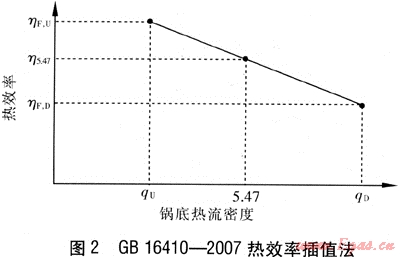 GB 16410—2007中的熱效率插值法是以鍋底熱流密度作為橫坐標(biāo),以熱效率作為縱坐標(biāo)建立直角坐標(biāo)系。當(dāng)用上限鍋測試熱效率時,其橫坐標(biāo)點qU對應(yīng)的熱效率為ηF,U;用下限鍋測試熱效率時,其橫坐標(biāo)點qD對應(yīng)的熱效率為ηF,D。然后以橫坐標(biāo)為5.47的豎直直線與ηF,U、ηF,D兩點連線的交點的縱坐標(biāo)值,作為此灶具燃燒器熱效率的最終結(jié)果η5.47(見圖2)。熱效率插值法是在不改變熱負荷的前提下得到的。