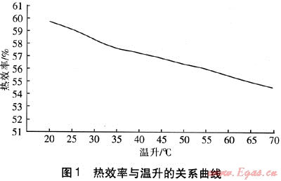 按照GB 16410—2007的測試要求,隨機選取多個燃燒器和測試用鍋,對不同溫升的熱效率進行了測試計算,取均值后得出了熱效率與溫升的關(guān)系曲線(見圖1)。